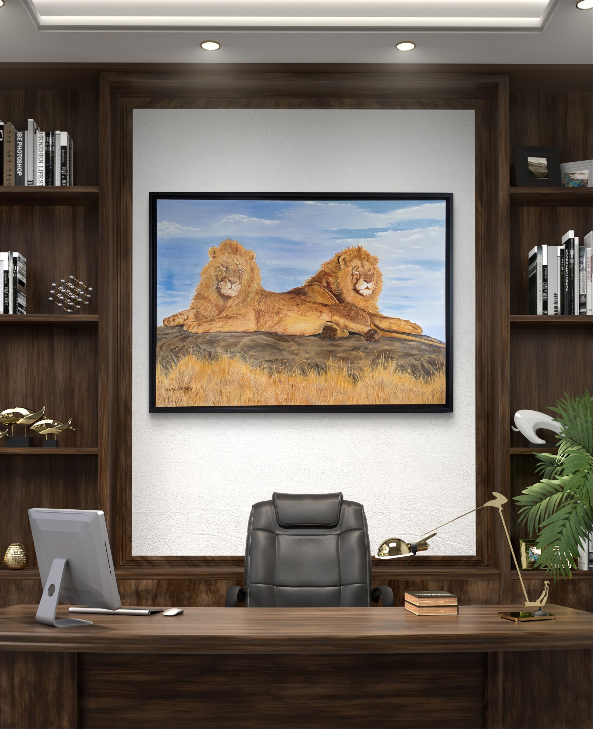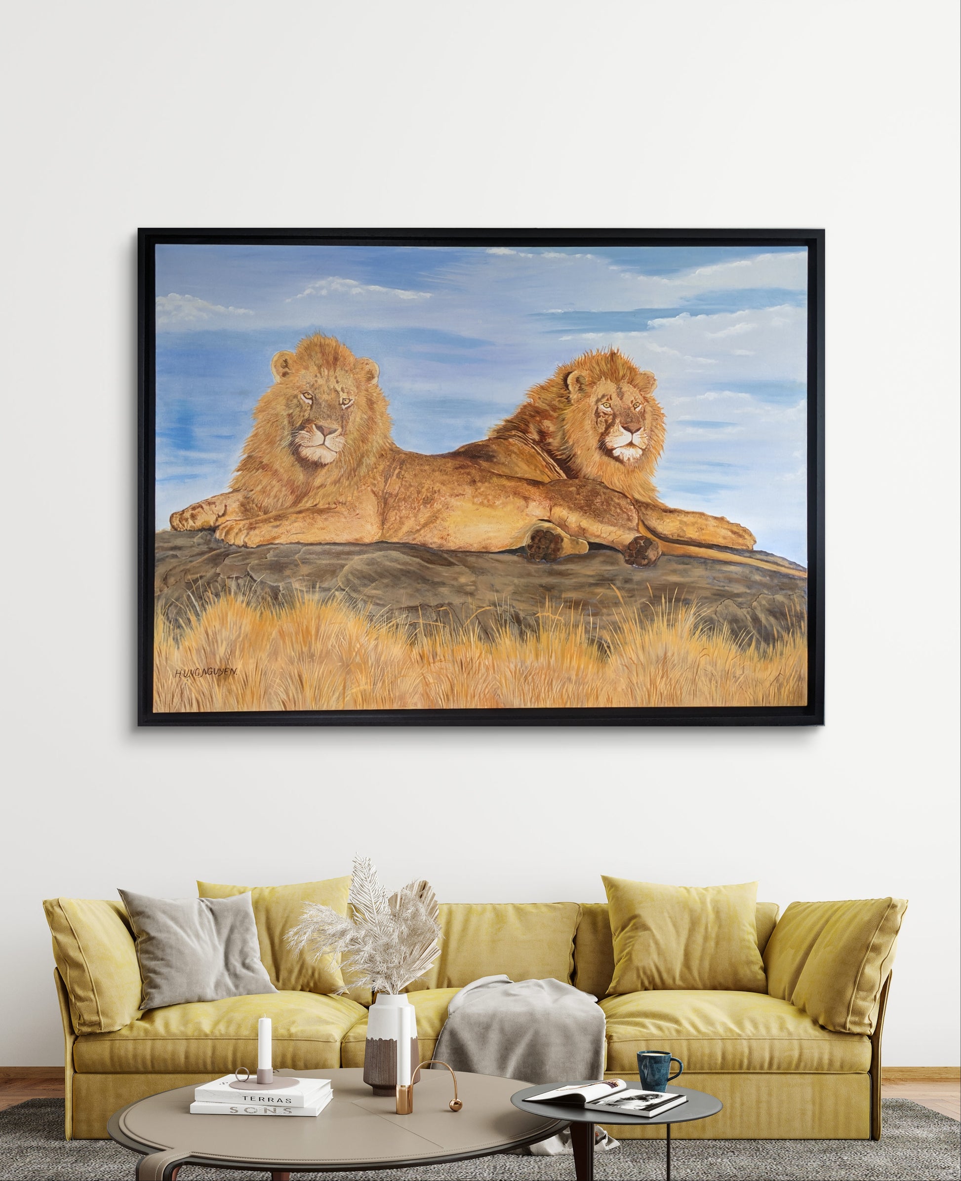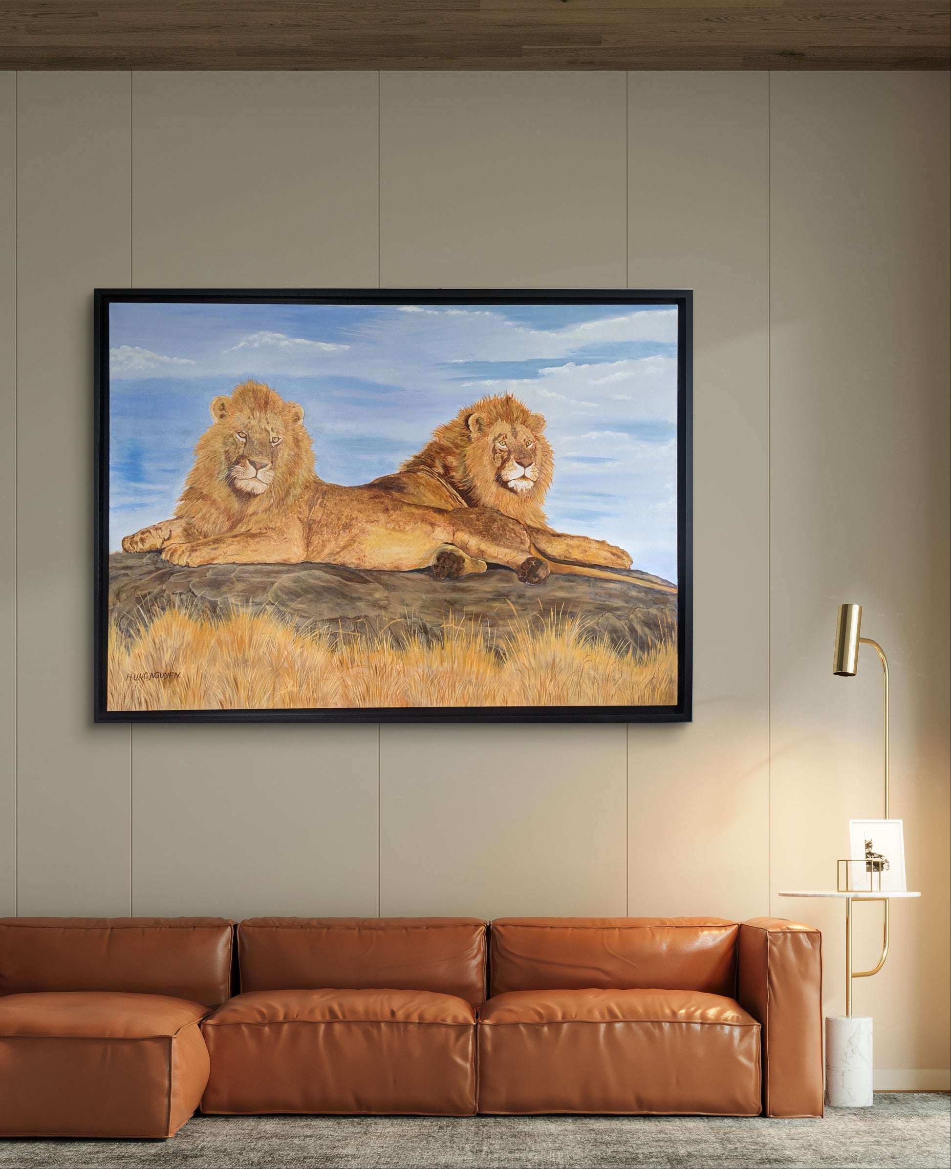 In the heart of the savanna, two majestic lions lie regally upon a sunlit rock. Their powerful forms are framed by the golden hues of the tall, swaying grass that stretches out beneath them. Above, the sky is a brilliant blue, dotted with soft, white clouds that drift lazily by. The lions, with their manes flowing like crowns, exude an air of strength, bravery, and calm. Their eyes, sharp and wise, reflect the bond they share as brothers, guardians of their realm. Their presence embodies the power and courage of the wild, yet also a serene and composed demeanor. The scene captures a moment of serene majesty, where the wild beauty of nature and the noble spirit of these magnificent creatures converge.