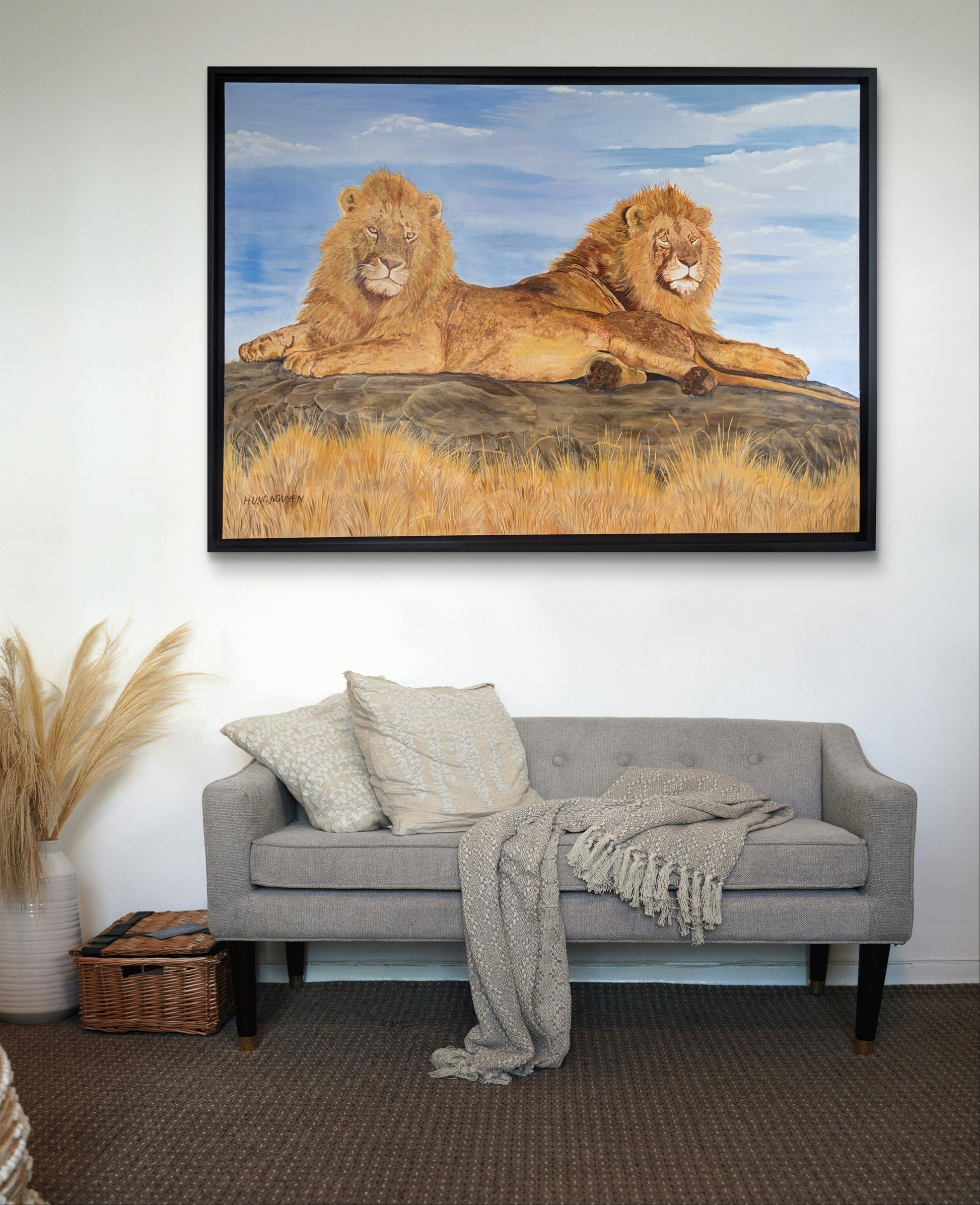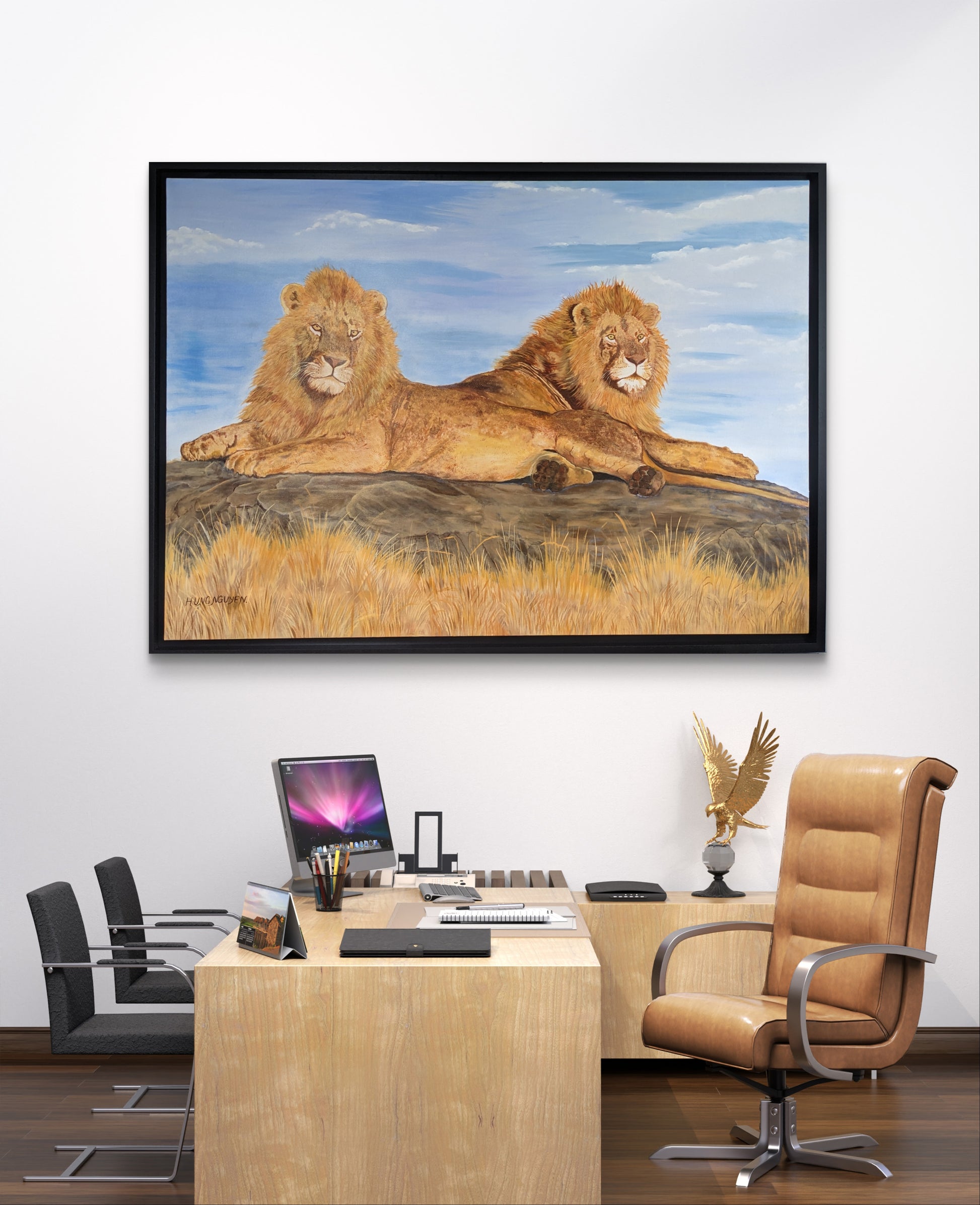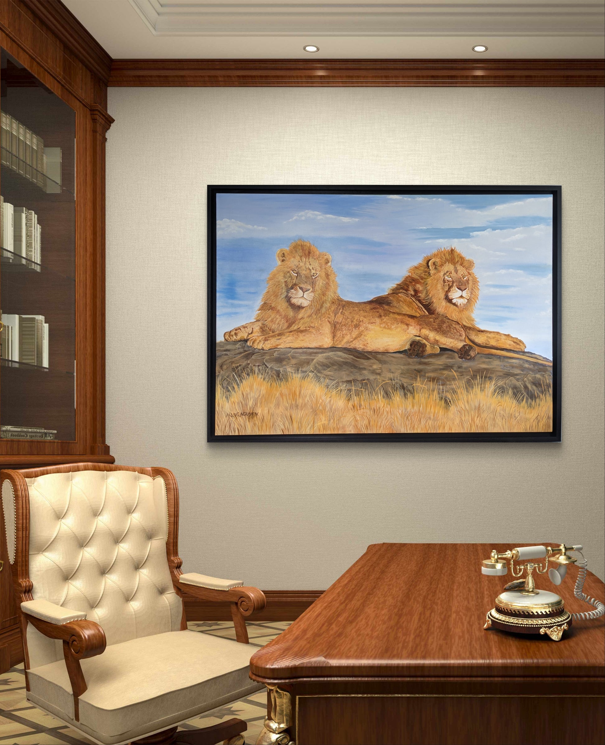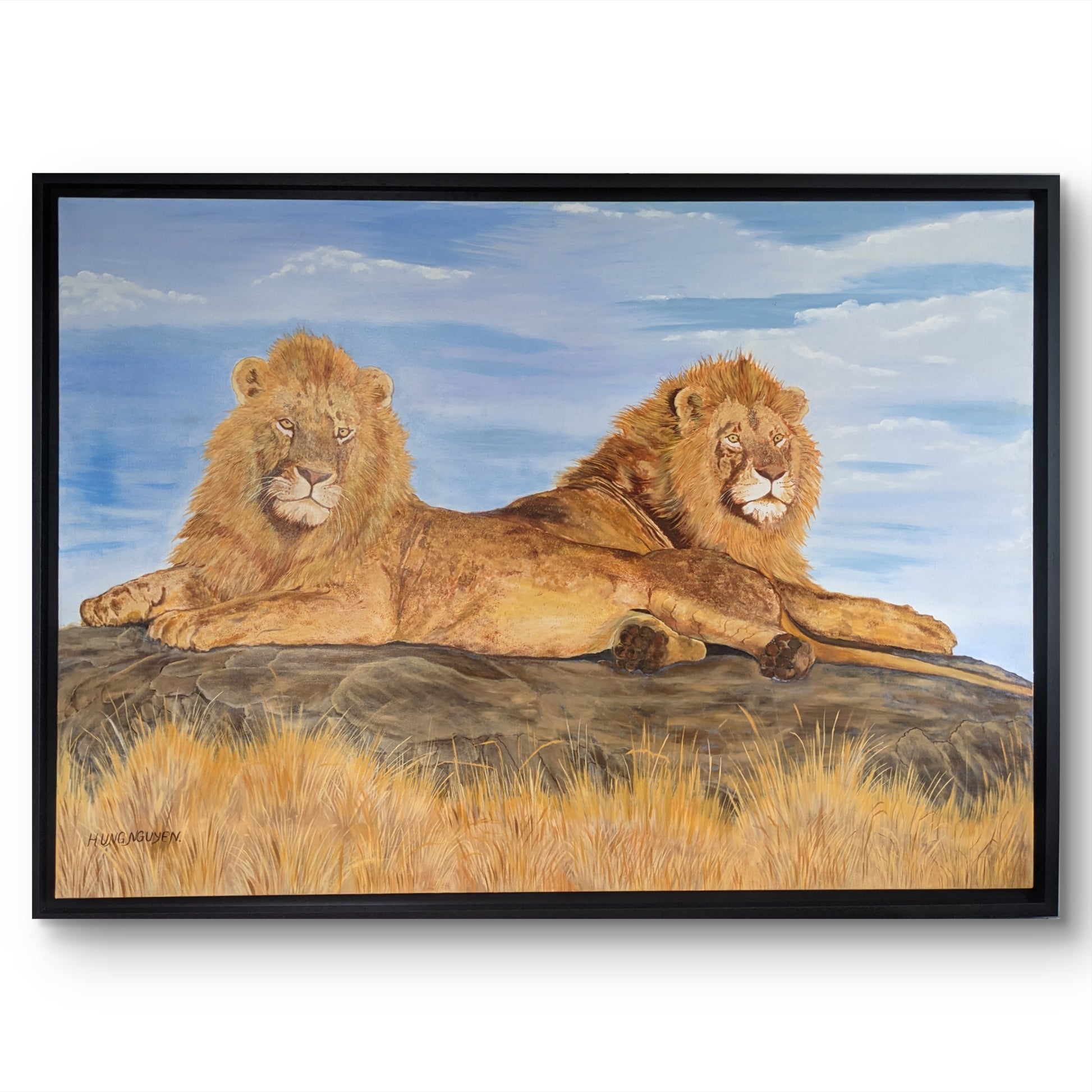 In the heart of the savanna, two majestic lions lie regally upon a sunlit rock. Their powerful forms are framed by the golden hues of the tall, swaying grass that stretches out beneath them. Above, the sky is a brilliant blue, dotted with soft, white clouds that drift lazily by. The lions, with their manes flowing like crowns, exude an air of strength, bravery, and calm. Their eyes, sharp and wise, reflect the bond they share as brothers, guardians of their realm. Their presence embodies the power and courage of the wild, yet also a serene and composed demeanor. The scene captures a moment of serene majesty, where the wild beauty of nature and the noble spirit of these magnificent creatures converge.