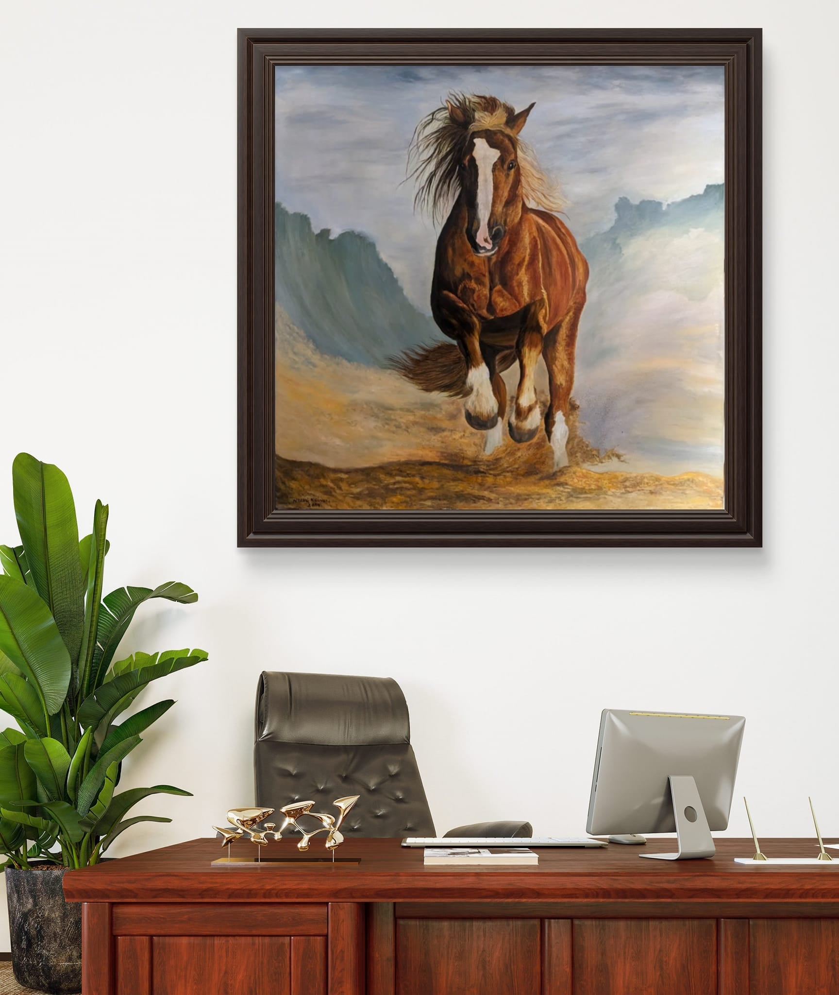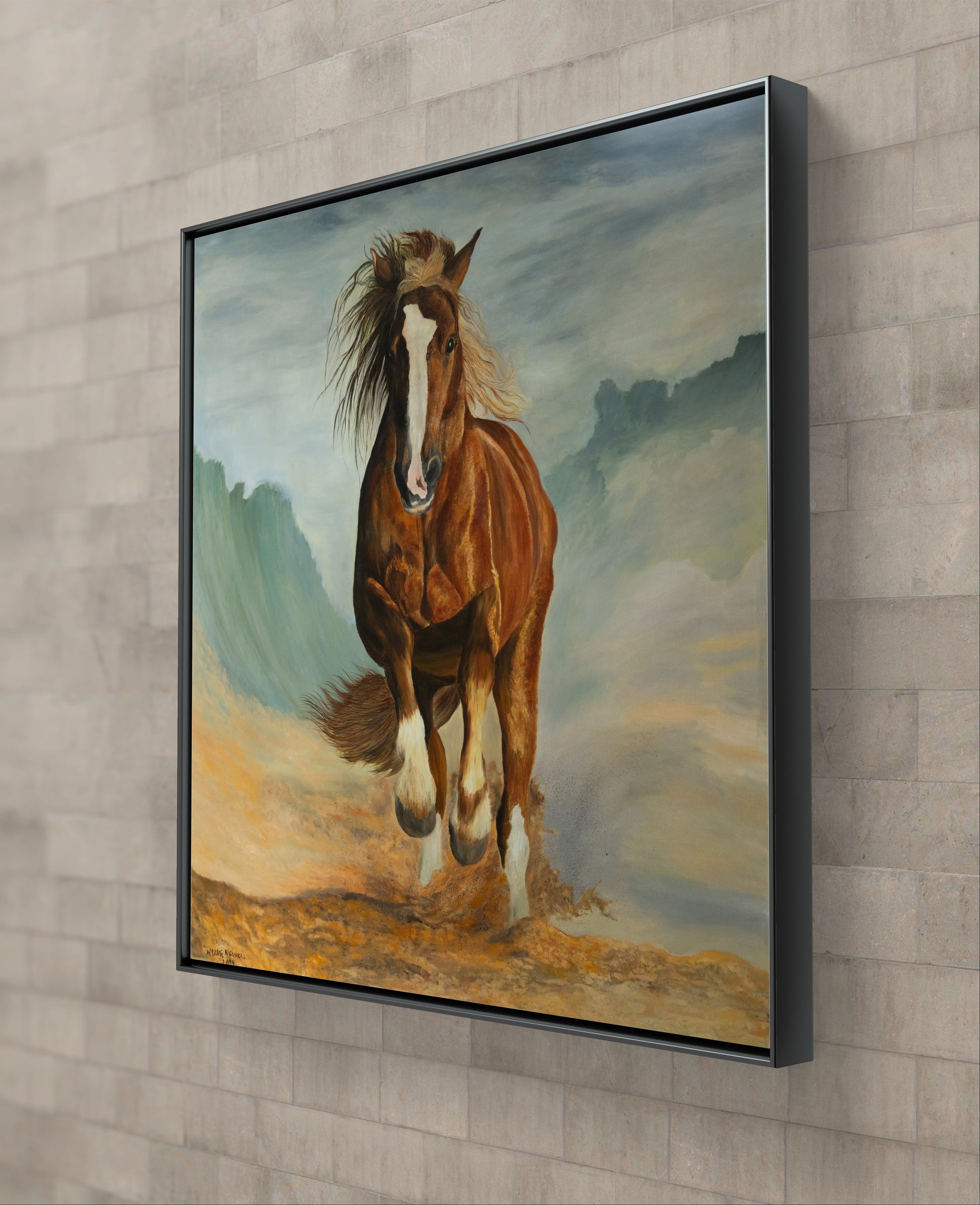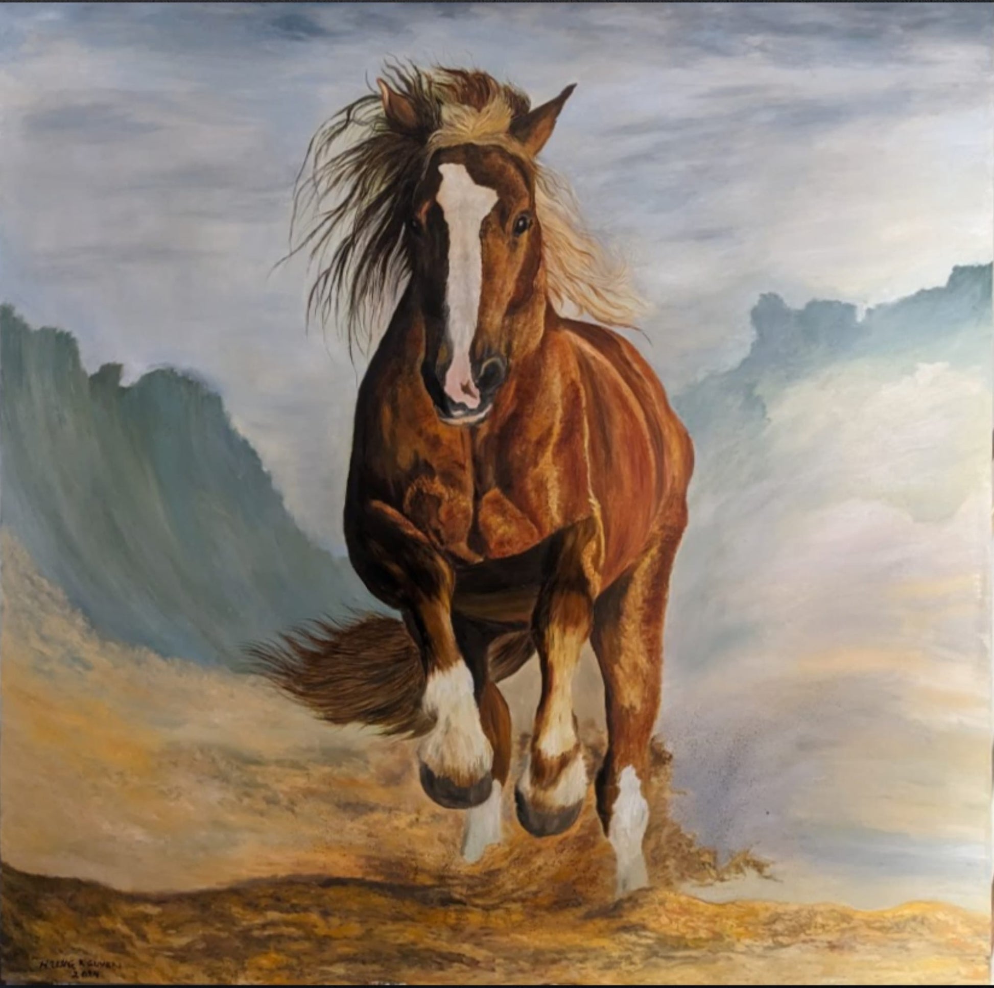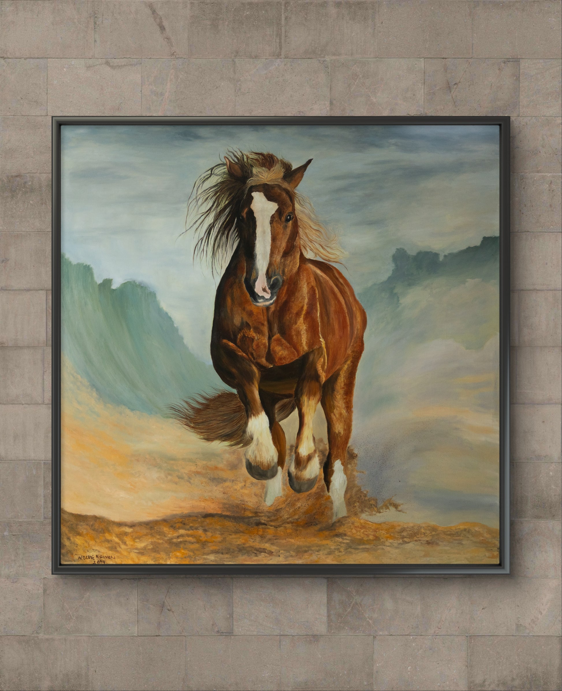 In the midst of a vast, windswept desert, a magnificent red horse leaps gracefully through the air, its powerful muscles rippling under the fiery coat. The sand beneath it swirls in chaotic patterns, whipped up by the relentless wind that howls across the landscape. The horse’s mane and tail stream behind it like flames, embodying the raw, untamed spirit of nature. Its eyes gleam with determination and freedom, capturing the essence of its wild journey. This painting, “Riding the Wind, Breaking the Wave,” encapsulates the sheer force and beauty of a creature in perfect harmony with the elements, breaking through barriers and soaring towards new horizons.
