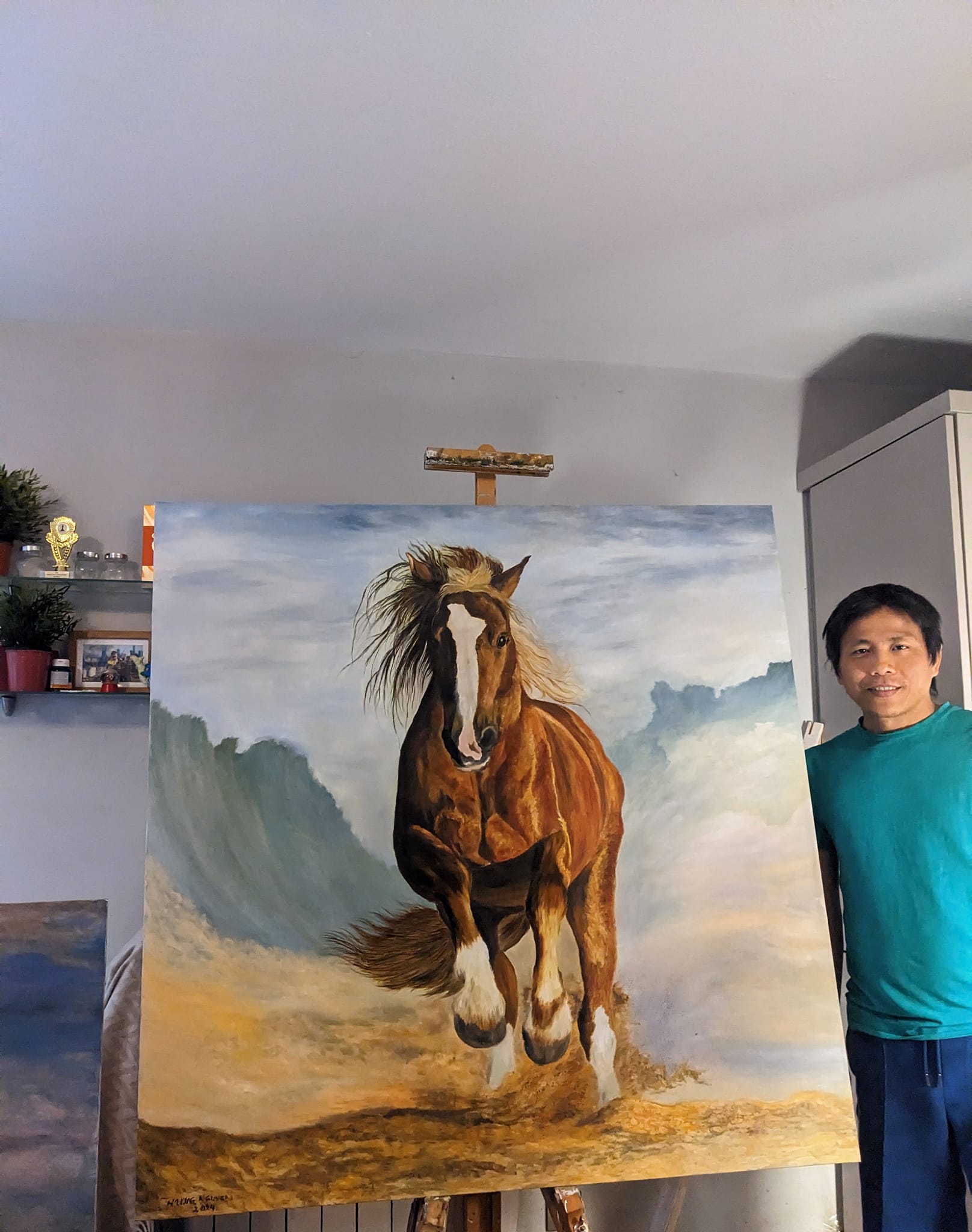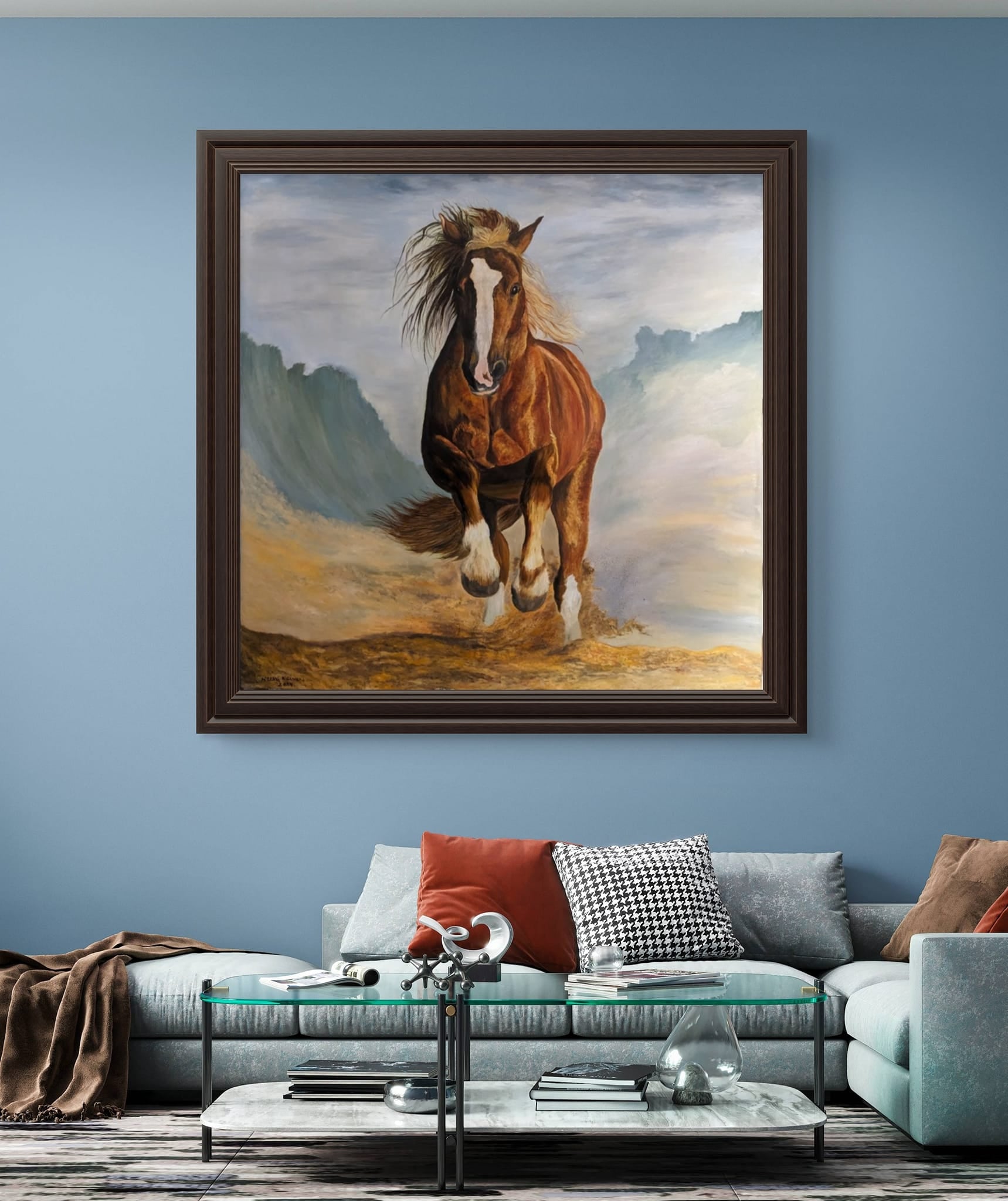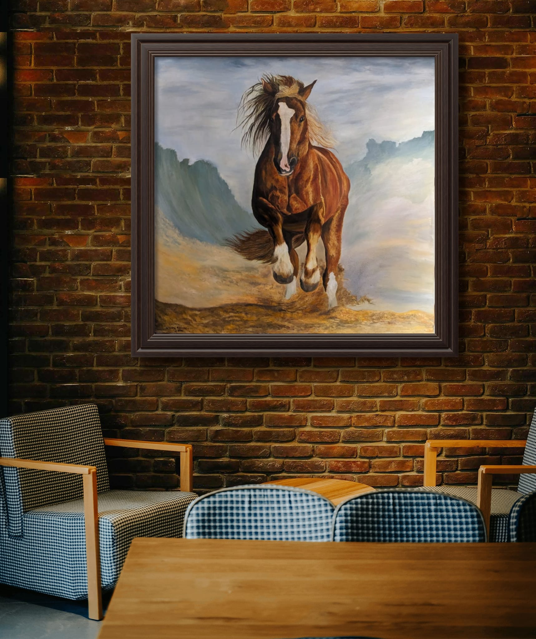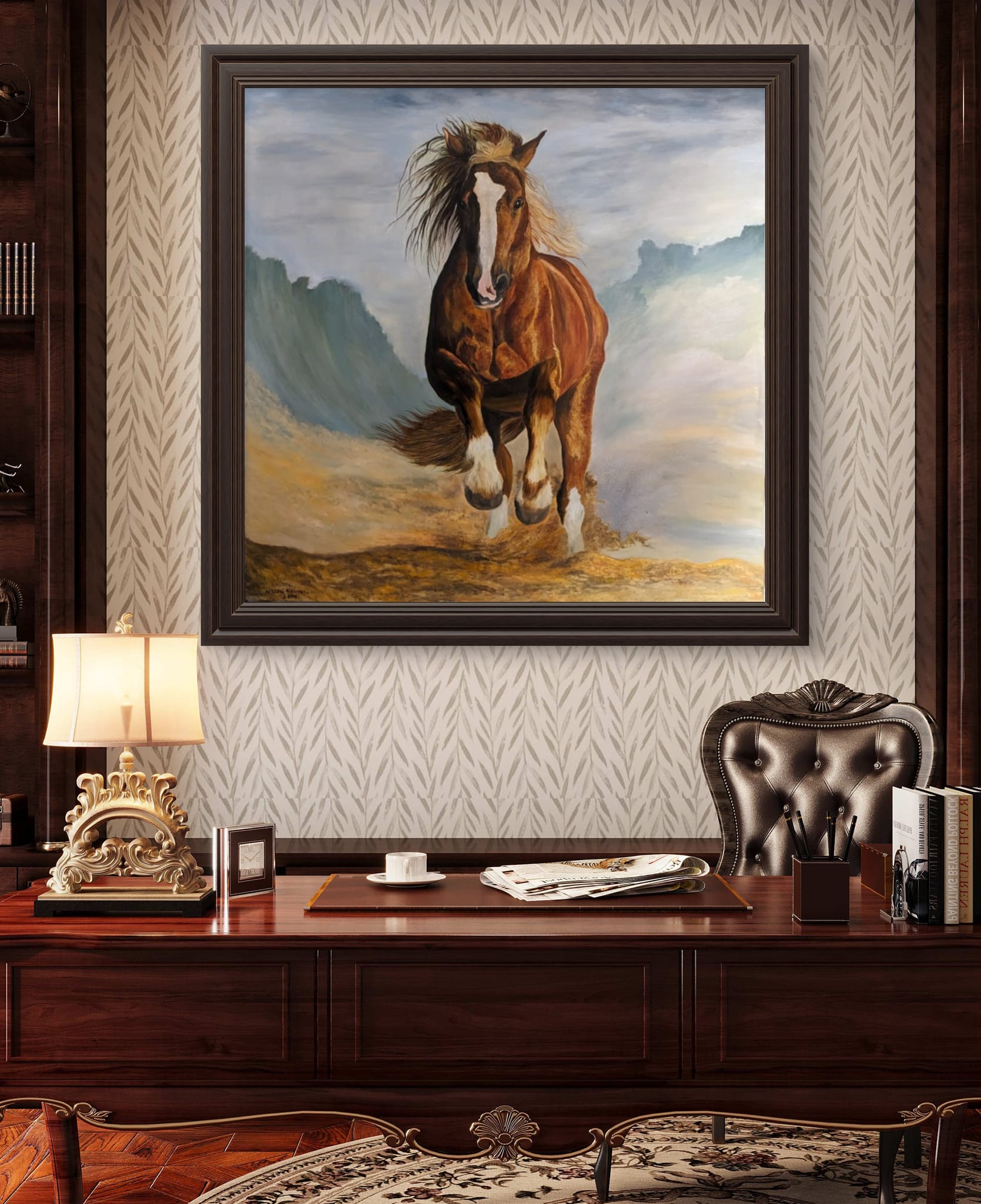 In the midst of a vast, windswept desert, a magnificent red horse leaps gracefully through the air, its powerful muscles rippling under the fiery coat. The sand beneath it swirls in chaotic patterns, whipped up by the relentless wind that howls across the landscape. The horse’s mane and tail stream behind it like flames, embodying the raw, untamed spirit of nature. Its eyes gleam with determination and freedom, capturing the essence of its wild journey. This painting, “Riding the Wind, Breaking the Wave,” encapsulates the sheer force and beauty of a creature in perfect harmony with the elements, breaking through barriers and soaring towards new horizons.
