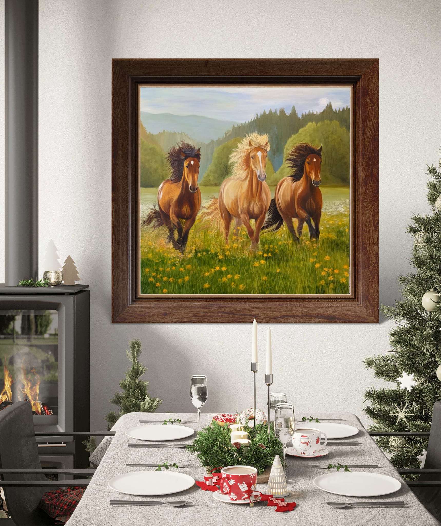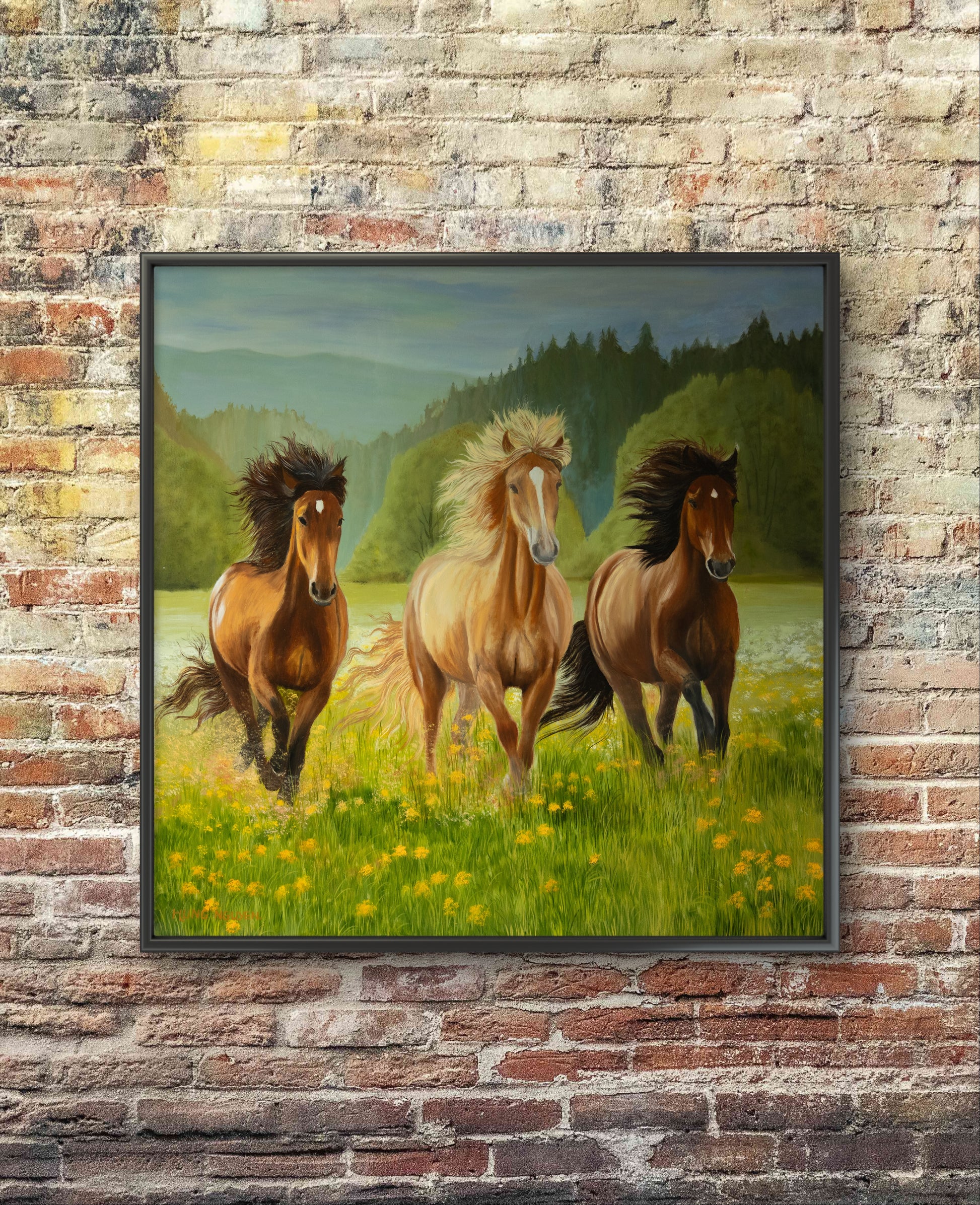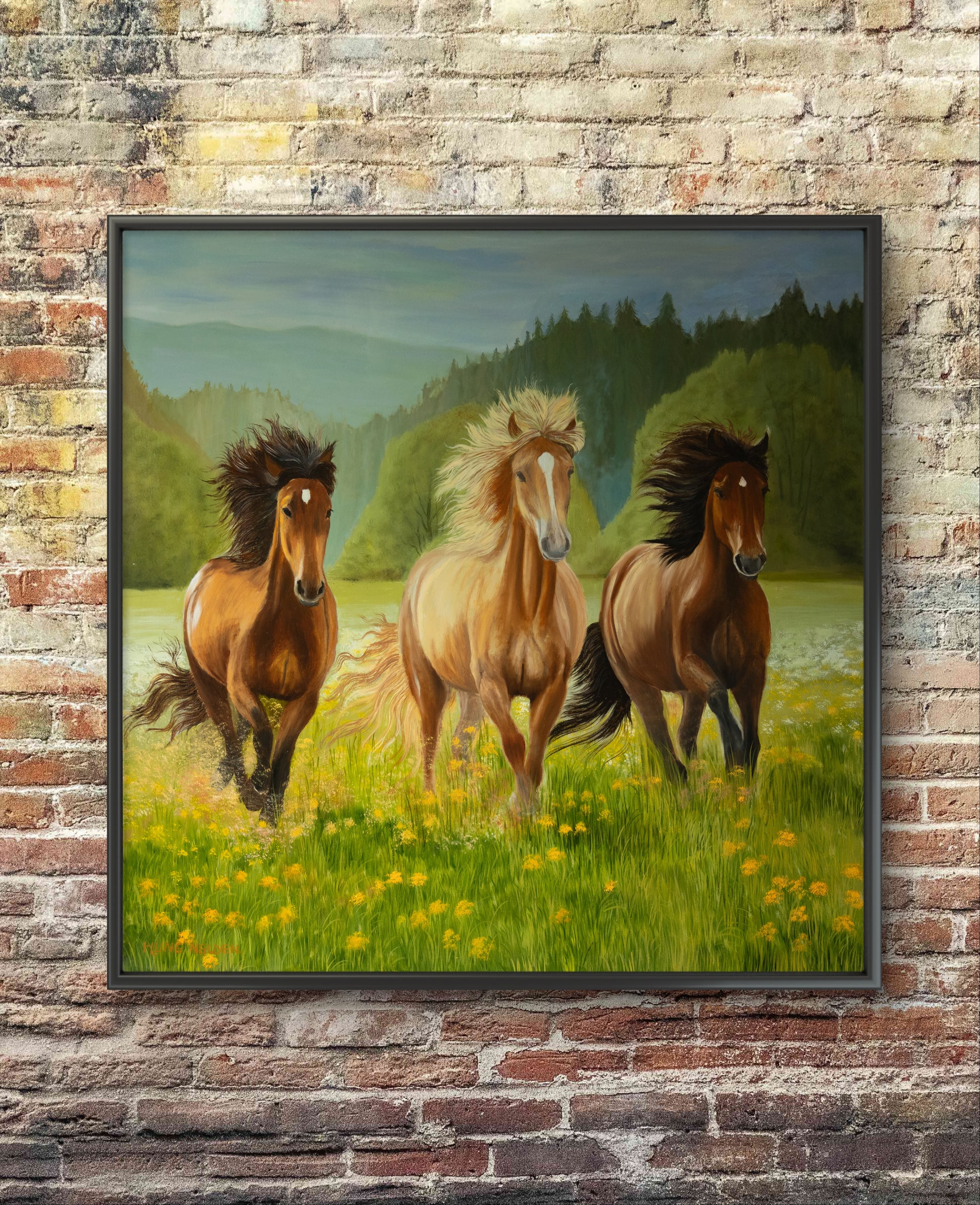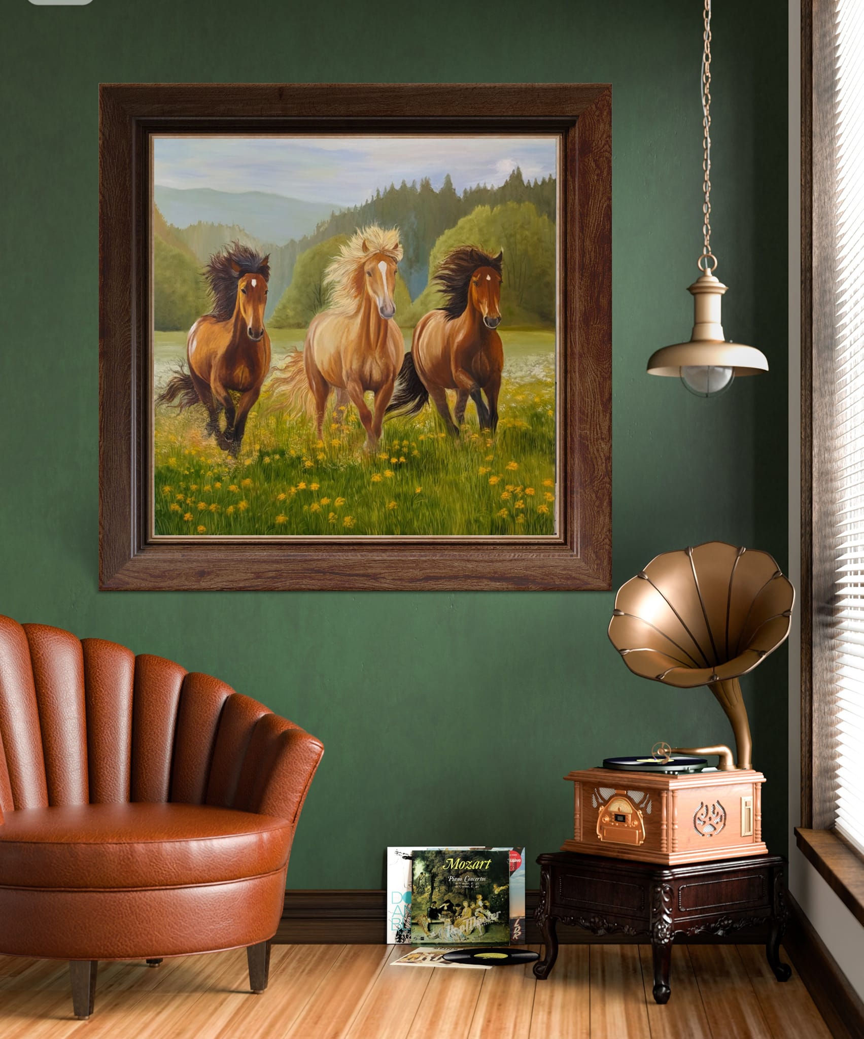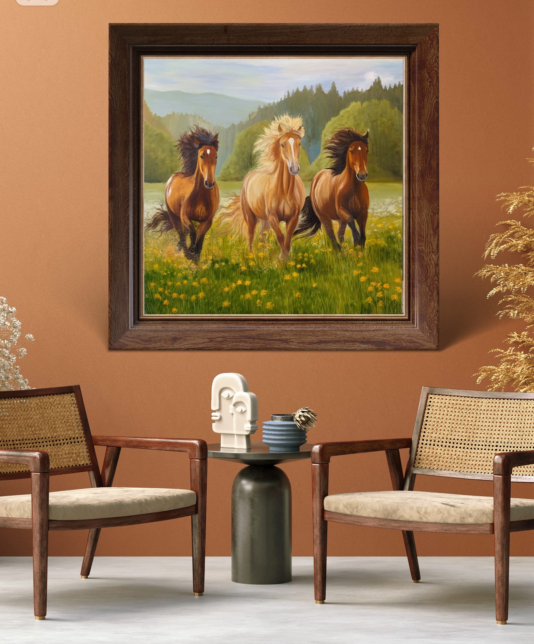 In a vibrant spring meadow, three majestic horses gallop with unbridled energy across the lush, green grass. Their powerful strides and synchronized movements embody the essence of speed and determination. The fresh spring air is filled with the scent of blooming flowers, and the sun casts a golden glow over the scene, highlighting the horses’ sleek coats. Each horse leaps gracefully, their hooves barely touching the ground, as if they are hopping towards their inevitable triumph. This painting, “Win Instant Success,” captures the exhilarating moment of pure joy and the relentless pursuit of victory, symbolizing the spirit of success and the beauty of nature in harmony.