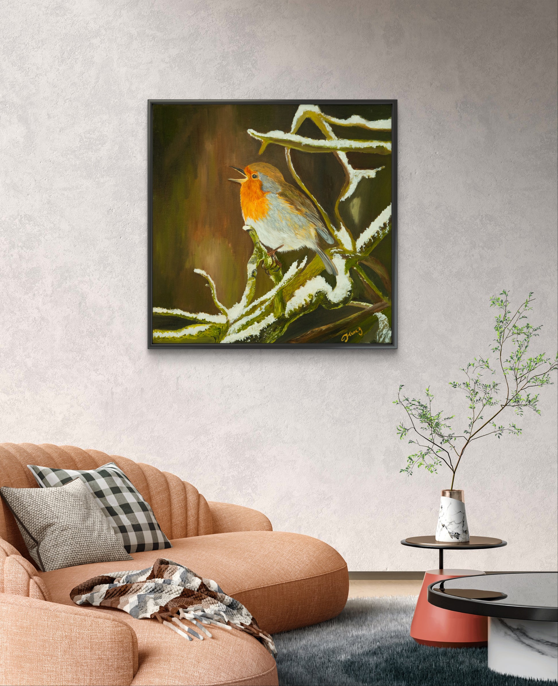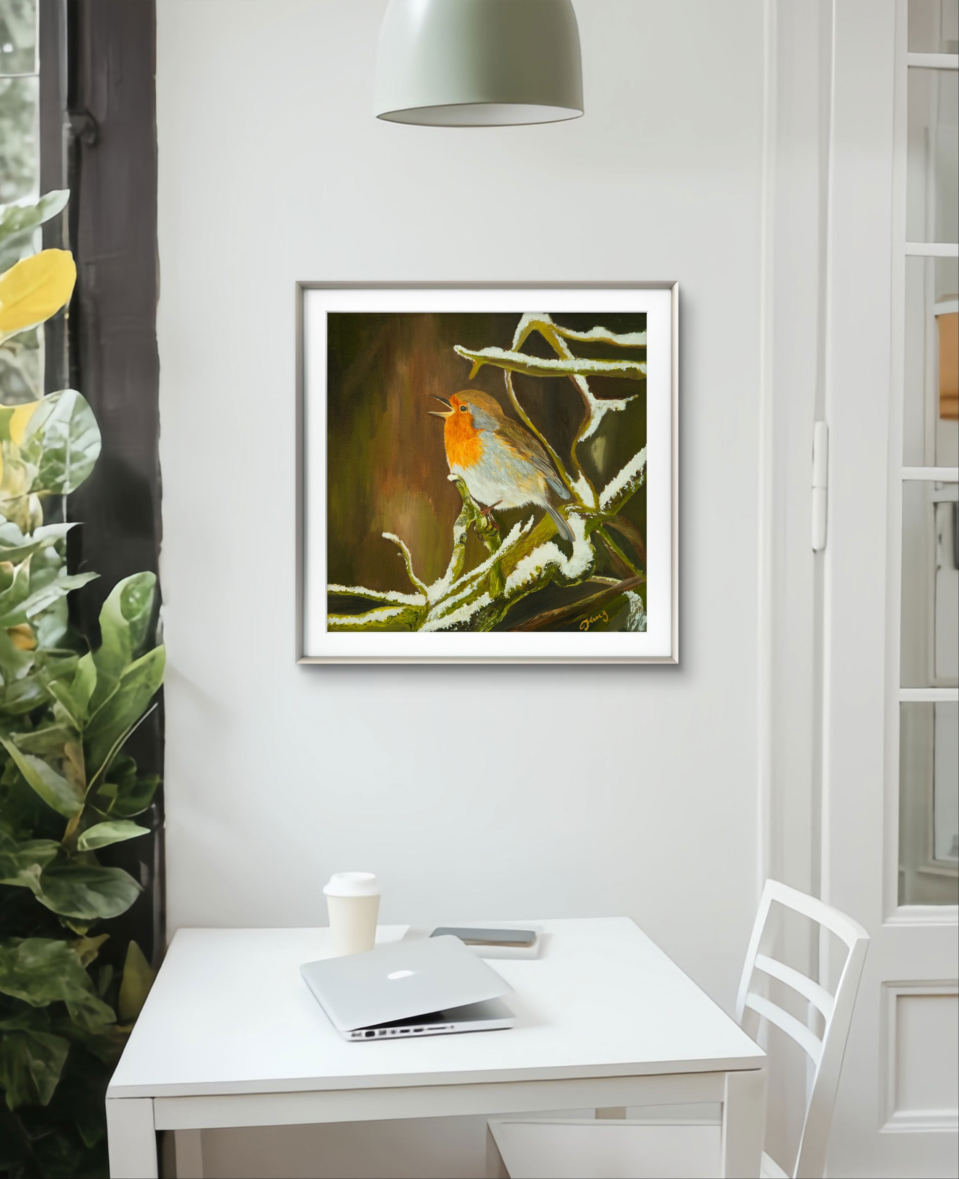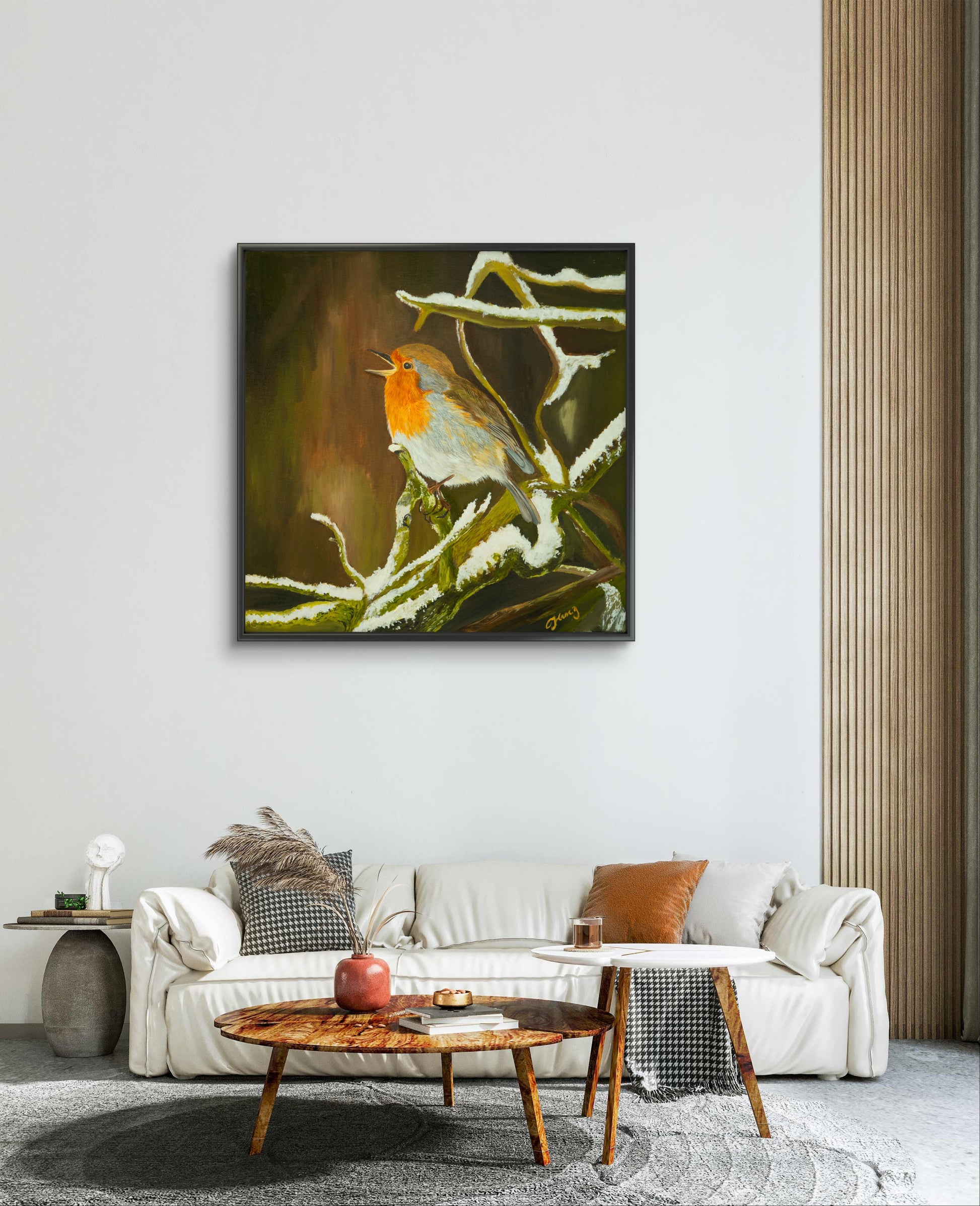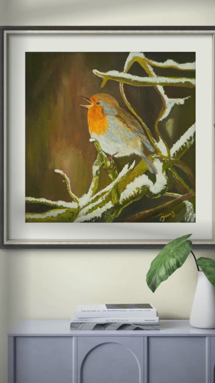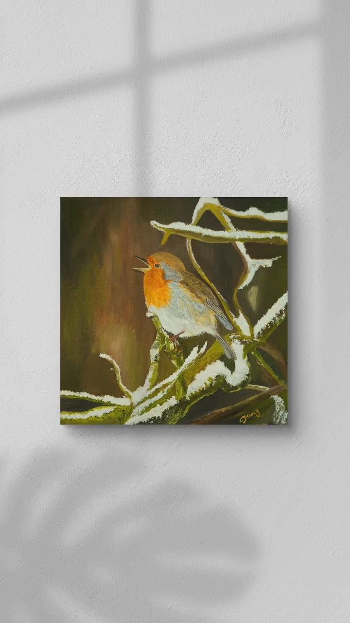 “Winter’s Melody”: This enchanting winter scene features a vibrant robin perched on a snow-covered tree trunk. The delicate snowflakes gently blanket the branches, creating a serene and tranquil atmosphere. The robin’s bright red breast stands out against the pristine white snow, symbolizing hope and warmth amidst the cold winter landscape. This painting beautifully captures the quiet elegance of nature and the resilience of life even in the harshest conditions.