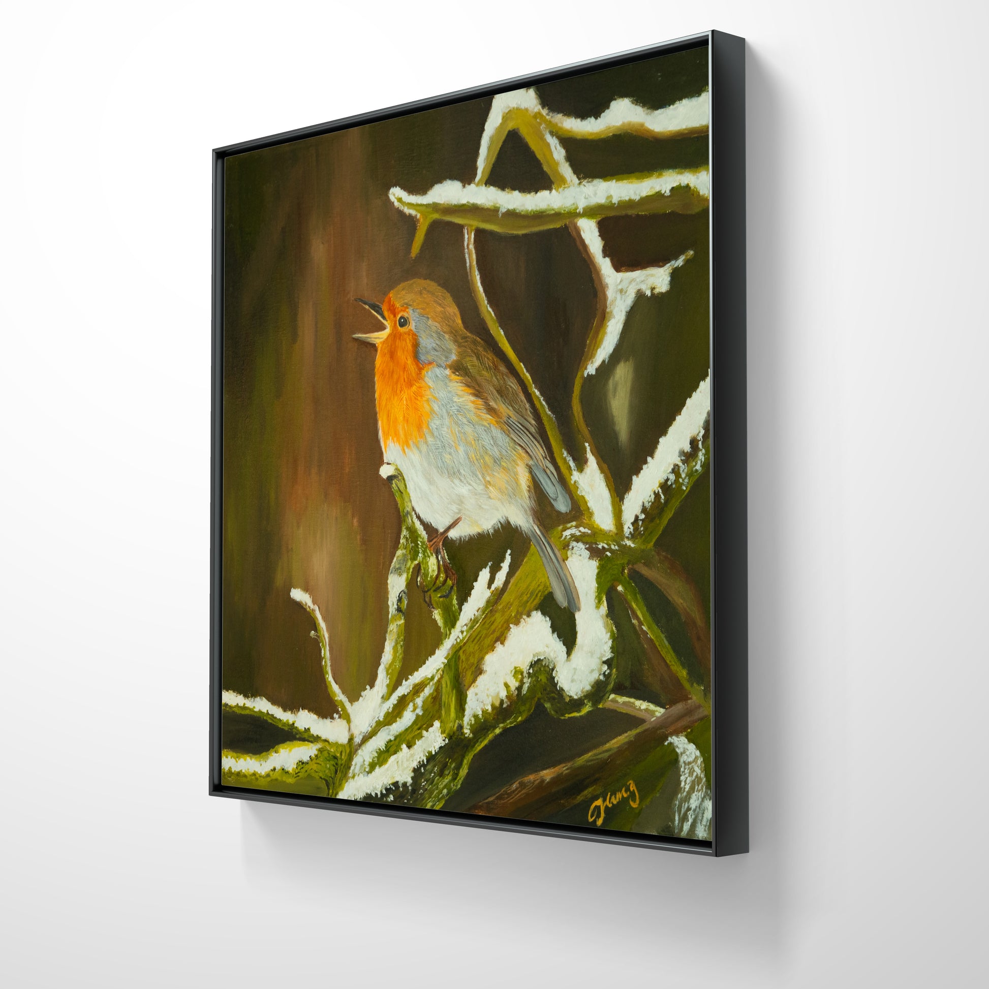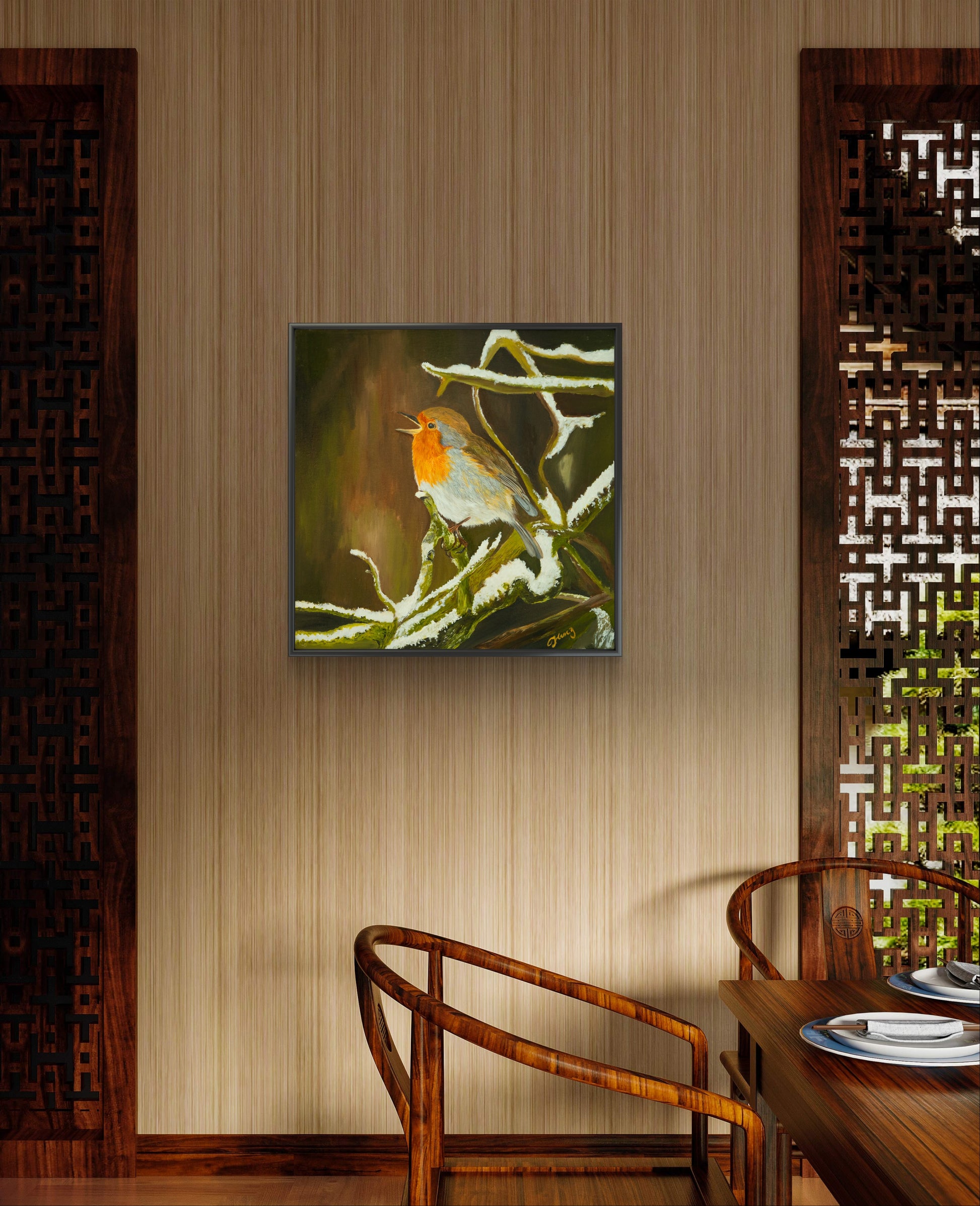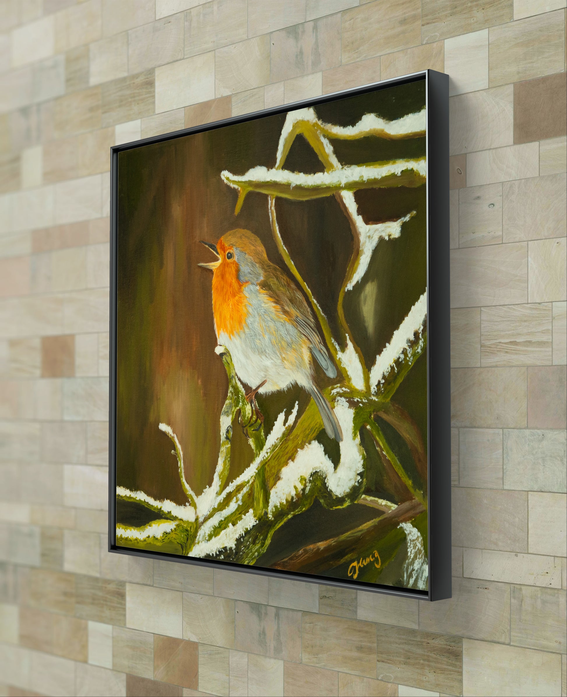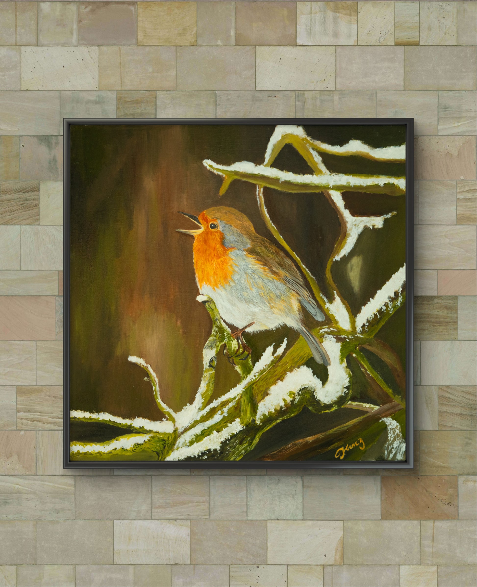 “Winter’s Melody”: This enchanting winter scene features a vibrant robin perched on a snow-covered tree trunk. The delicate snowflakes gently blanket the branches, creating a serene and tranquil atmosphere. The robin’s bright red breast stands out against the pristine white snow, symbolizing hope and warmth amidst the cold winter landscape. This painting beautifully captures the quiet elegance of nature and the resilience of life even in the harshest conditions.